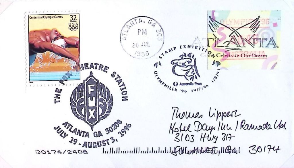 Im Fox Theatre – dem Haus der australischen Mannschaft – war nicht nur ein Sonderpostamt der US-Post stationiert, sondern auch eines der australischen Post, das auch den gleichen Sonderstempel führte wie das zweite SPA Australiens in Atlanta auf der Olympiabriefmarkenausstellung OLYMPHILEX.