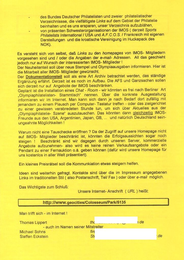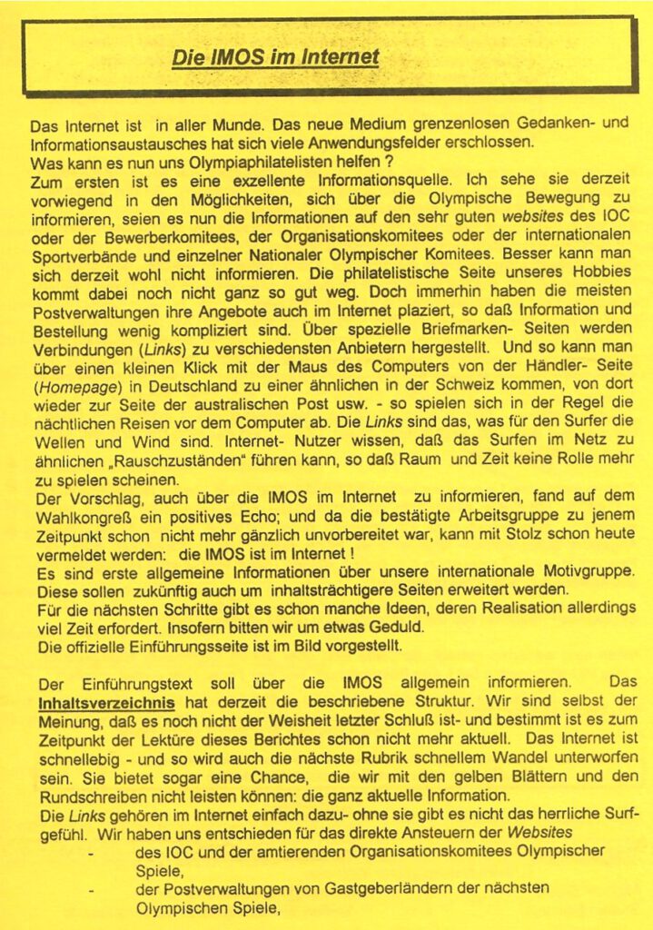 Auf dem IMOS-Kongress 1998 in Berlin wurde beschlossen, eine IMOS-Website einzurichten. Das Internet war noch relativ neu, zumindest für philatelistische Arbeitsgemeinschaften.