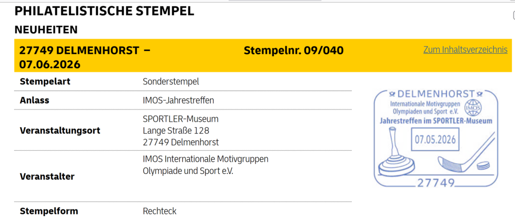Unser Sonderstempel zum Jahrestreffen 8. April 2026 sportphil 2026, Informationen Teilen mit: Auf Facebook teilen (Wird in neuem Fenster geöffnet) Facebook Auf X teilen (Wird in neuem Fenster geöffnet) X DelmenhorstSportler-MuseumSportmemorabilia