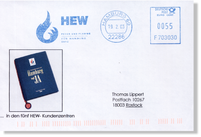 Absenderfreistempel der Sponsoren der Hamburger Bewerbung: Hamburgische Electricitäts-Werke